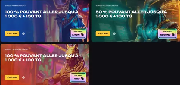 En plus des bonus sans dépôt, le casino propose aussi un pack de bienvenue exclusif allant jusqu’à 3 000 € et 300 free spins répartis sur vos trois premiers dépôts :