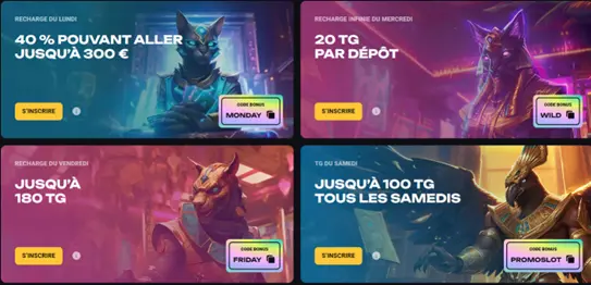 - Samedi : jusqu’à 100 FS – code PROMOSLOT – wager x40