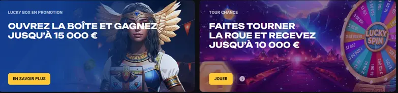Par ailleurs, la Lucky Box permet de gagner jusqu’à 15 000 € ou des tours gratuits (wager x30 ou x5).