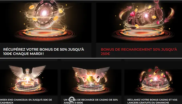 - Un bonus de recharge de 50% jusqu’à 250€, chaque mois – Dépôt minimum : 20 € – Wagering : 30× – code promo MONTHLY50