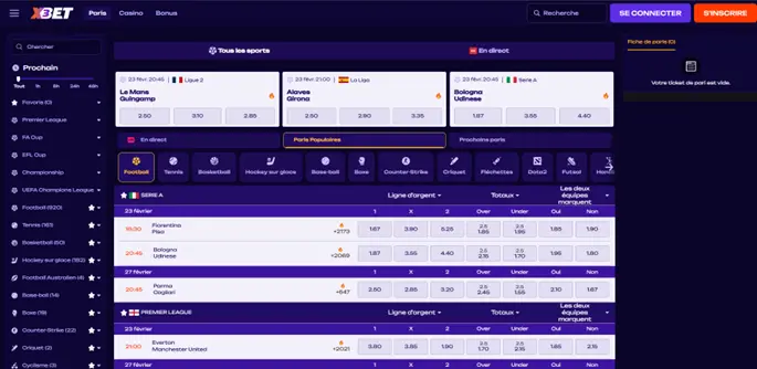 X3Bet offre une couverture sportive complète avec paris en live et en pré-match. On retrouve les sports majeurs comme le football, le tennis et le basket, mais aussi les compétitions les plus reconnues (Ligue 1, Ligue 2, La Liga, Serie A, Premier League...). Et, cerise sur le gâteau, l’offre inclut des eSports populaires (Dota 2, League of Legends...).